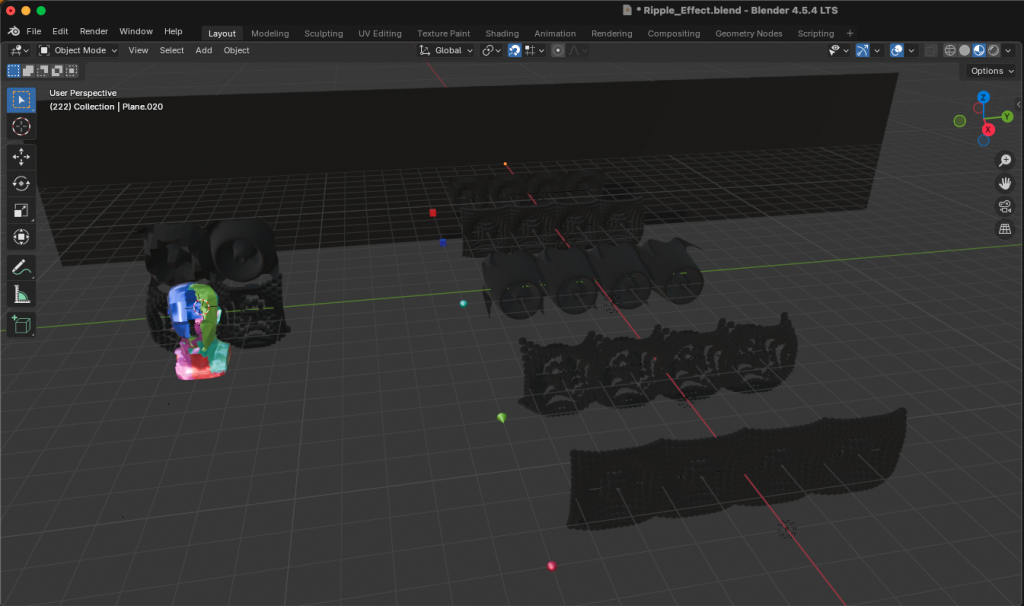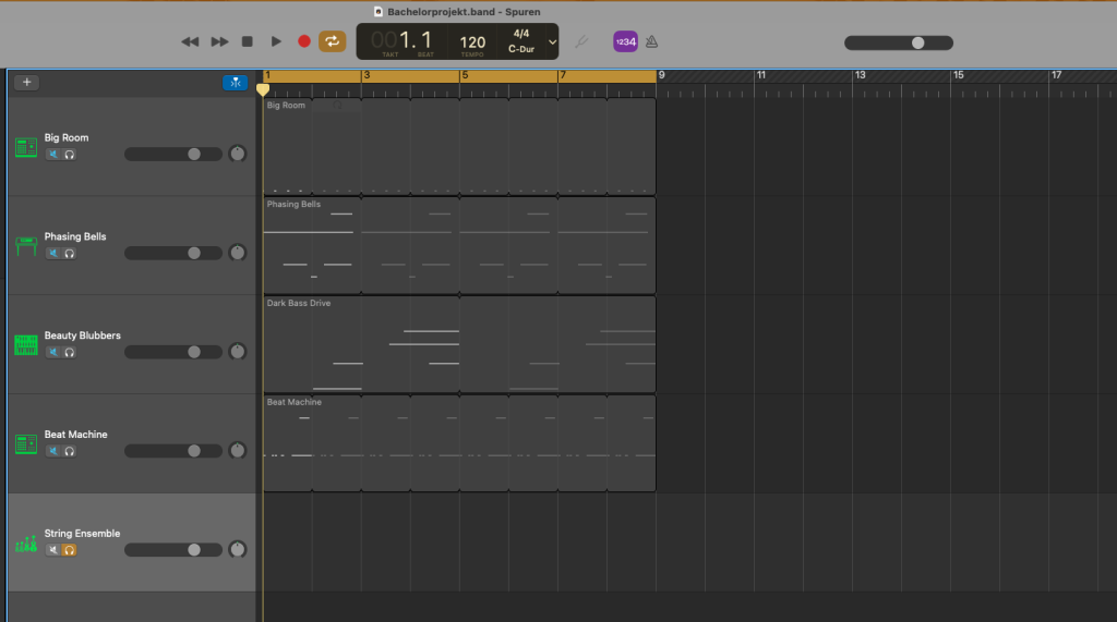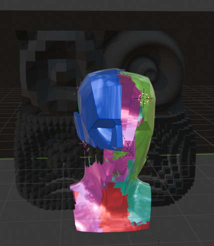 Im Laufe des Entstehungsprozesses habe ich meine Idee des Big-Five-Konzepts weiterentwickelt. Das neue Konzept ist eine audiovisuelle Installation mit vier Vintage-Monitoren. Die Monitore sind quadratisch und werden später übereinander platziert. Diese Monitore spielen alle ein Video ab, aber immer nur ein Viertel des Sichtbereichs, sodass sich die Formen im Video von einem zum nächsten Bildschirm bewegen. Das Video selbst ist dabei ein audiovisueller Aufbau, bei dem einzelne geometrische Grundformen bis zum obersten Bildschirm schweben, dort stehen bleiben und nach und nach ein Gesicht ergeben. Jede Form hat hierbei eine Tonspur, die sie repräsentiert. Wenn dies geschehen ist, entstehen insgesamt vier Gesichter aus dem ersten Modell, welche jeweils auf einem Monitor platziert sind. Zu diesem Zeitpunkt ist aus den einzelnen Tonspuren auch ein richtiger Track entstanden. Ab da werden die Gesichter animiert und interagieren miteinander, passend zur Musik.